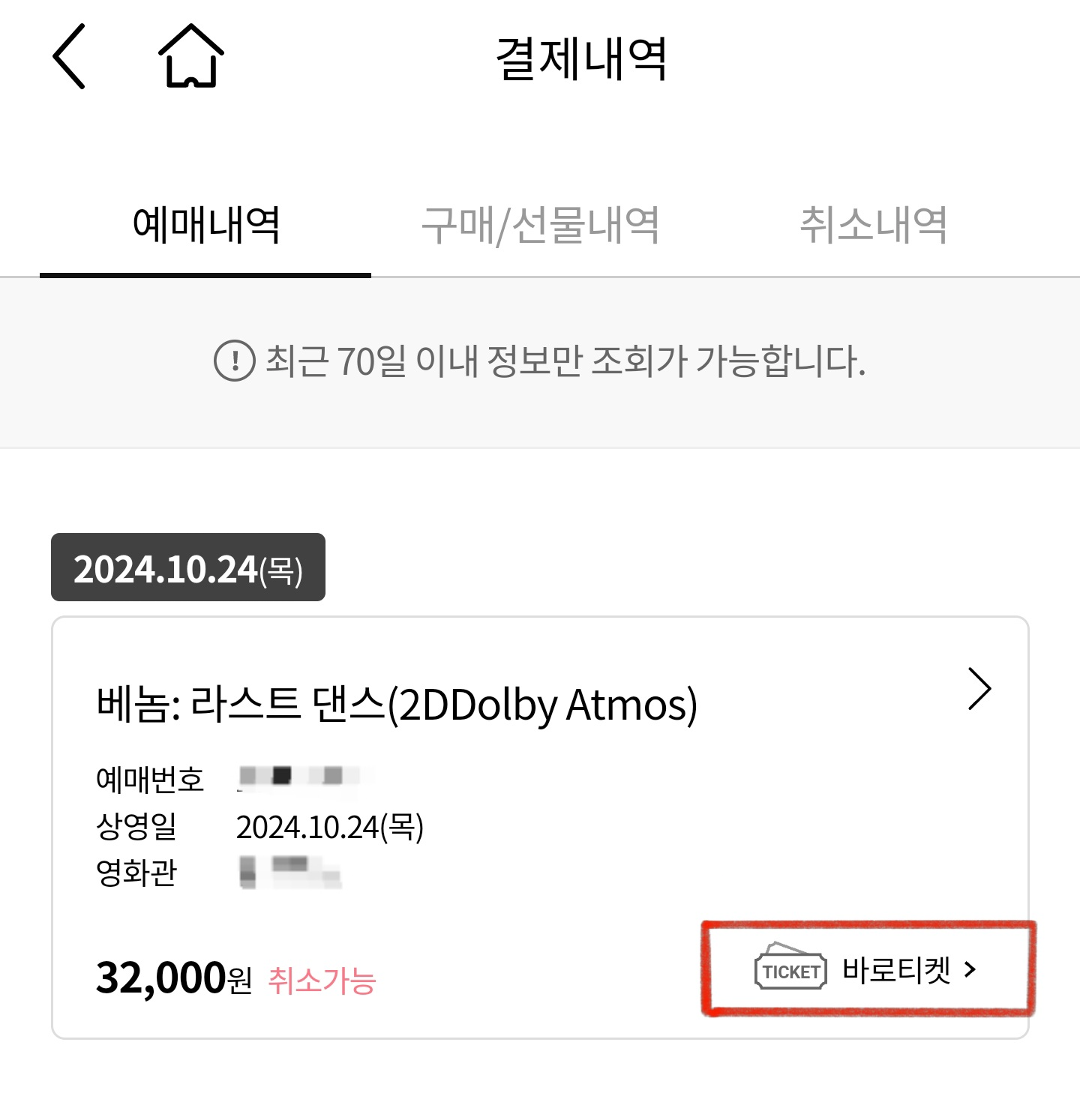 어플에서 영화 예매 후 결제 내역에 들어가서 티켓 확인을 합니다.