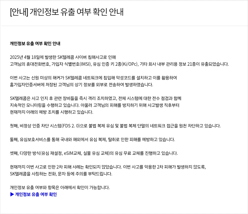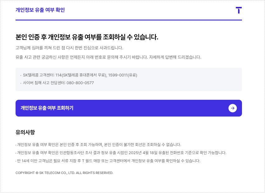 "내 정보도 유출됐을까?" 걱정하시는 분들을 위해, SKT 공식 유출정보 조회 서비스 이용 방법을 안내드립니다.