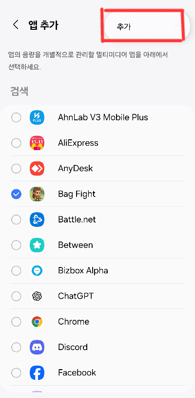 개별 앱으로 음량을 조절할 어플을 선택하고 오른쪽위에 삼선버튼을 눌러 추가 눌러줍니다.